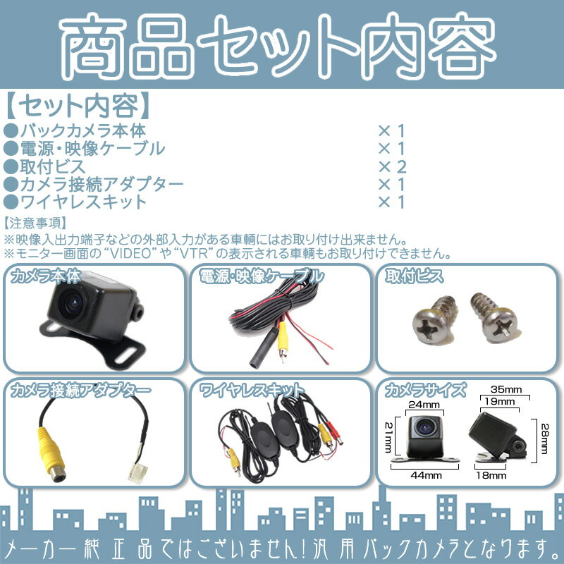 商品仕様 外観:角型 固定方法:ネジ固定 or 両面テープ固定(付属しません) センサー:CMOS 画素数:628pix×582pix(42万画素) 視野角:水平 120° / 垂直 100 °/ 対角 170° 出力映像:鏡像 ガイドライン:有or無し 映像出力端子:RCA 定格電圧:DC12V 消費電流:70mA 本体サイズ(最大):横 24mm × 高 28mm × 奥行 19mm 電源ケーブルの長さ:約200cm 映像ケーブル長さ:約500cm 商品内容 ・バックカメラ本体 × 1 ・電源ケーブル × 1 ・映像ケーブル × 1 ・ワイヤレスキット × 1 ・映像出力変換アダプター × 1 注意事項 ※必ずサイズ・形状・適合等をご確認の上、ご入札・ご購入ください。